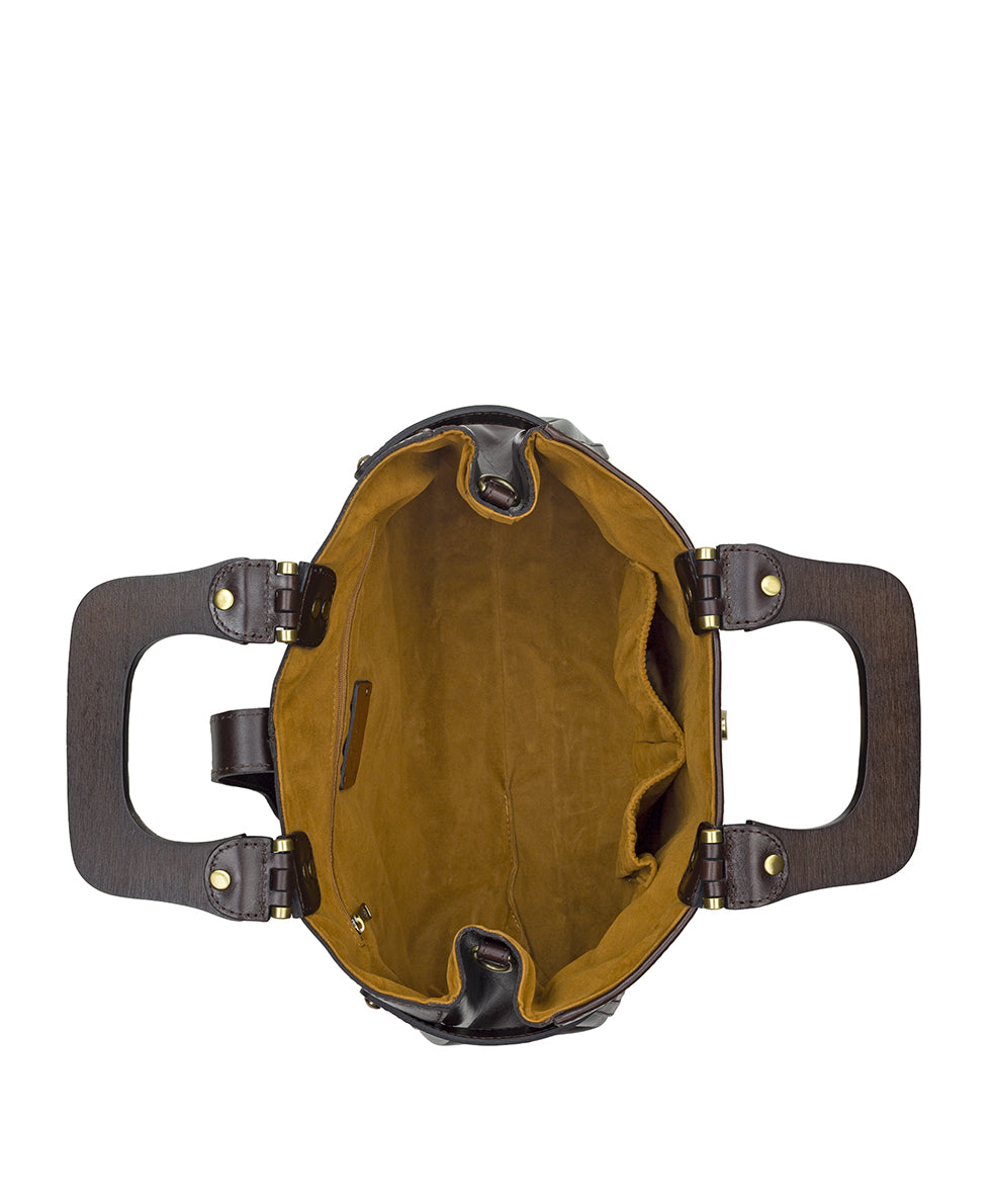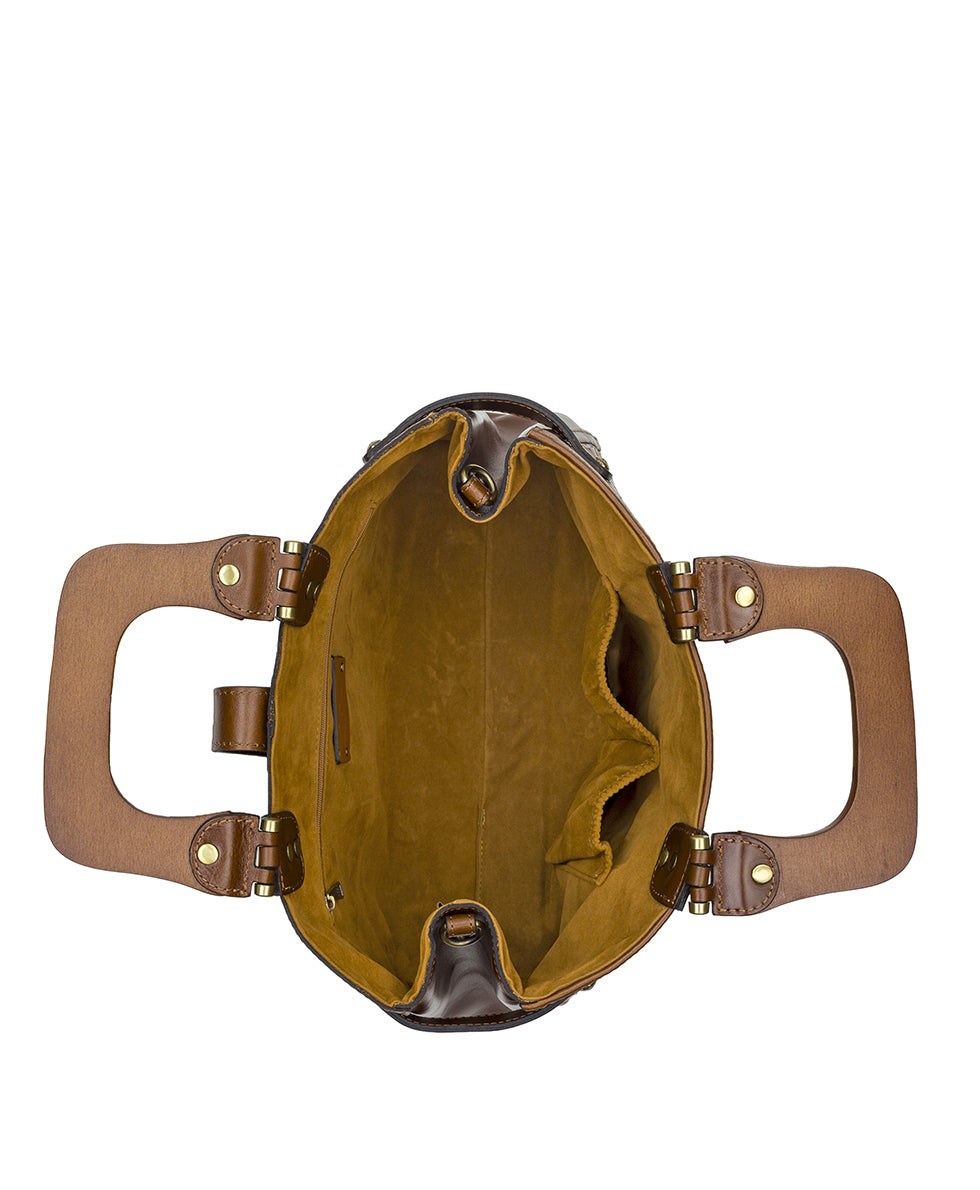 In Vintage Distressed Woven Leather. the Sancia has eye-catching wood handles and supple leather trim. A true statement piece. it combines elegance and charm. bringing a touch of vintage glamour to your wardrobe. Carry it with confidence. It is effortless. chic. and always in style.